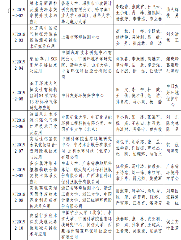 2019年度环境保护科学技术奖拟授奖项目名单公示
